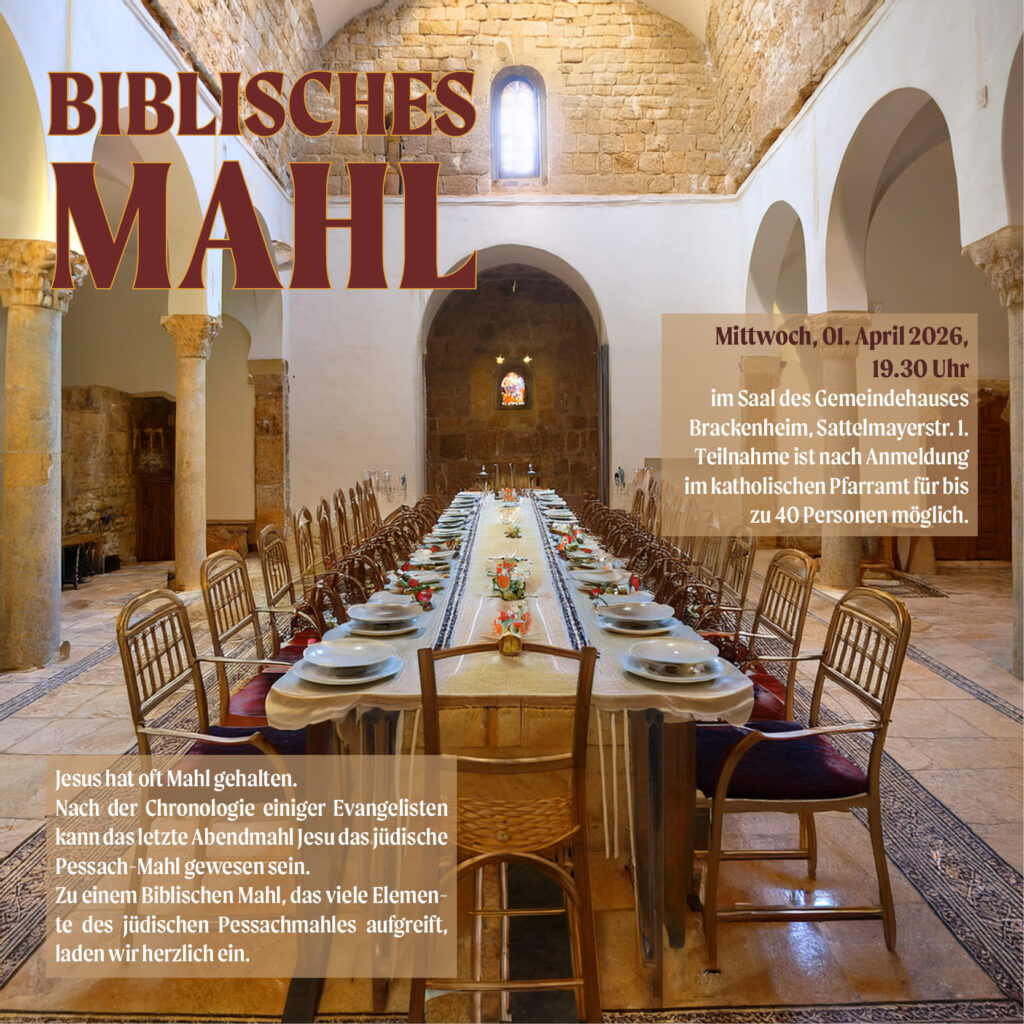 Jesus hat oft Mahl gehalten. Nach der Chronologie einiger Evangelisten kann das letzte Abendmahl Jesu das jüdische Pessach-Mahl gewesen sein. Zu einem Biblischen Mahl, das viele Elemente des jüdischen Pessachmahles aufgreift, laden wir herzlich ein: