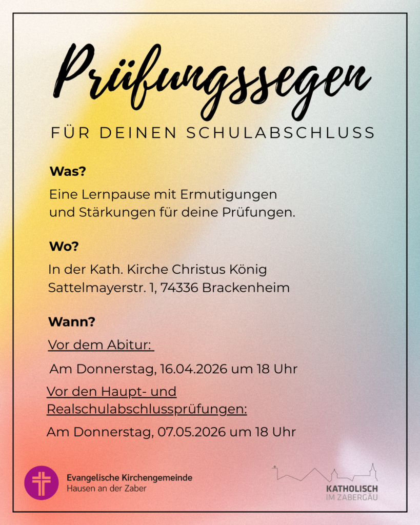 Stehen bei dir bald Abschlussprüfungen an? Am Vorabend vor den ersten schriftlichen Prüfungen findet in Brackenheim in der katholischen Kirche Christus König um 18 Uhr ein ökumenischer Prüfungssegen statt. Nimm dir eine Stunde Zeit für dich, bring deine Anspannung und Angst vor Gott und lass dich ermutigen und stärken. Komm gerne vorbei und bringe deine Klassenkamerad*innen mit.